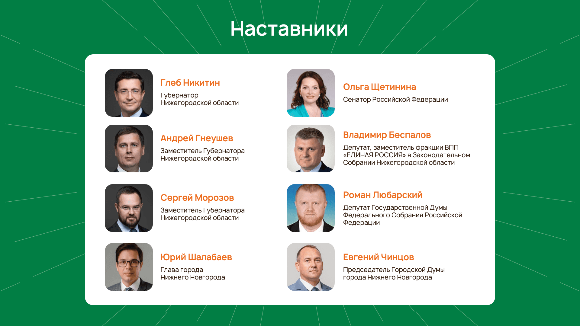 Проект «Нижегородцы» направлен на обучение и подготовку кадров для развития муниципальных территорий, вовлечение молодёжи в местное самоуправление и укрепление профессиональных связей между муниципалитетами Нижегородской области.