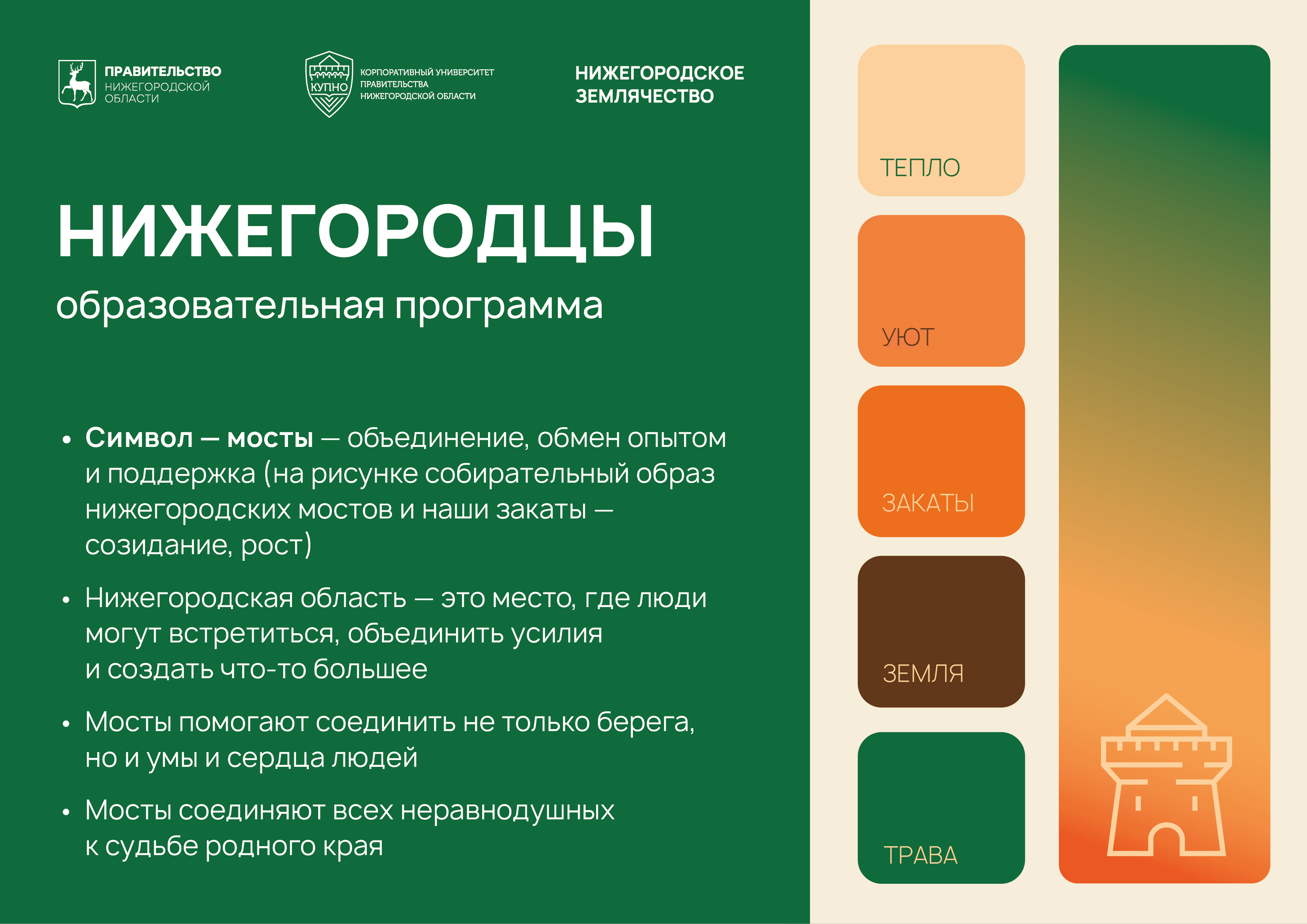Необходимо разработать фирменный стиль проекта, передающий самобытность Нижегородчины и искреннее чувство любви к родному краю.